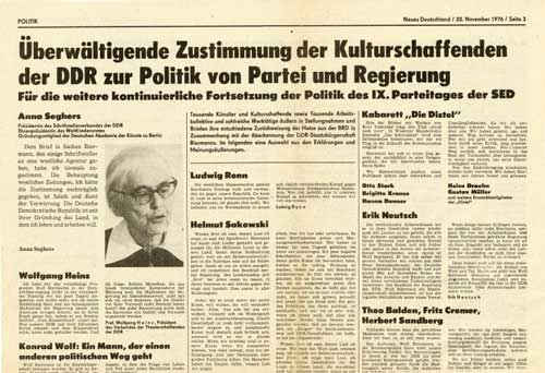 Kontaktschuld Es sind dreizehn Personen, die unterzeichnen: Sarah Kirsch, Christa Wolf, Volker Braun, Fritz Cremer, Franz Fühmann (er erteilt abwesend carte blanche), Stephan Hermlin, Stefan Heym, Günter Kunert, Heiner Müller, Rolf Schneider, Gerhard Wolf, Erich Arendt und Jurek Becker. Man beschließt, den einheimischen Medien – der Nachrichtenagentur ADN und dem "Neuen Deutschland" (ND) – die Erklärung sofort zu geben. Die Nachrichtenagenturen Reuters und AFP erhalten den Text mit Sperrvermerk von einigen Stunden. Auch im Vorsprung des Wissens um mehrere Jahrzehnte ist die Lektüre eminent spannend, was nicht nur daran liegt, dass im Präsens geschrieben wurde. Anfangs unterschätzten die Protagonisten den Vorgang bzw. glaubten an ein Einknicken der SED-Führung. Heym, der nun wieder an seine Arbeit gehen wollte, findet allerdings – wie auch all die anderen - nicht zur Ruhe. Zum einen erhält er zustimmende Telefonate (die er abbürstet, zum einen, weil er nicht weiß, ob es Fallen sind und zum anderen, weil er glaubt, dass er abgehört wird), zum anderen jedoch harsche Ablehnung, letzteres vor allem in den offiziellen DDR-Medien. Es gibt seitenlange Ergebenheitsadressen im ND, endlose Stellungnahmen, die in den Nachrichten verlesen werden, die alle die Ausbürgerung rechtfertigen. Die schneidigen Kommentare des "Dr. K.", in Wahrheit wohl "Dr. Kertzscher […] ehemaliges Mitglied der NSDAP und Ritterkreuzträger, auch sein akademischer Titel stamm[t] aus der glorreichen Zeit." Es sind an erster Stelle Anna Seghers und Hermann Kant, später auch Walter Janka und Peter Hacks; auch der sei zu den "Philistern übergelaufen", so Heym süffisant. Aber das wäre auszuhalten. Gravierender ist der Druck, der von Seiten der Parteigremien und des Schriftstellerverbandes auf jeden einzelnen aufgebaut wird. Gleichzeitig gibt es weitere Proteste gegen die Ausbürgerung durch Schauspieler und Filmleute; besonders die Anekdoten um Manfred Krug sind nett. Die Lage ist unübersichtlich, unter anderem auch wegen zahlreicher Widerrufe, die aufgrund von Pressionen erfolgen. (Das Jargonwort "Kulturschaffende" ist hier omnipräsent.) Hauptvorwurf an die Protestler: Man hätte dem Klassenfeind dadurch in die Hände gespielt, dass man ihm bzw. dessen Nachrichtenmedien die Protestnote zugeschickt hätte. Diese werde nun zur Anti-DDR-Propaganda verwendet. Heute, 45 Jahre später, nennt man so etwas "Kontaktschuld": Alleine die Tatsache, dass ein Text in den "falschen" Medien, von den "falschen" Personen publiziert bzw. zitiert wird, diskreditiert dessen Aussage. Damals wie heute absurd. Was hätte man tun sollen? Die Erklärung der 13 wurde in den DDR-Medien nicht veröffentlicht. Das Argument, von Christa Wolf formuliert: "Druckt unsere Erklärung ab im Neuen Deutschland, sie ist sehr gemäßigt, und sie enthält bereits die Distanzierung vom Westen. Wie sollen wir denn etwas Zusätzliches schreiben zu einer Erklärung, die hier gar nicht veröffentlicht wurde?" Stattdessen werden nur die parteitreuen Gegenstimmen veröffentlicht, was für die Konsumenten der offiziellen DDR-Medien ein gehöriges Maß an Phantasie und Abstraktionsvermögen verlangt, denn man hat ja offiziell keine Kenntnis davon, was die anderen dort angreifen.